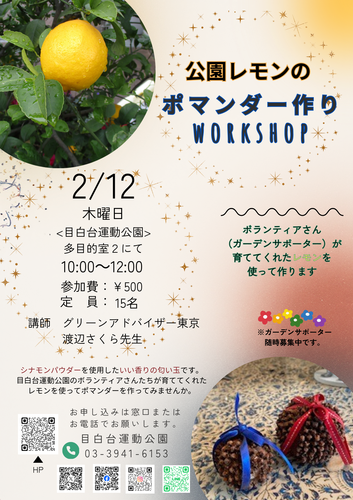 2月12日(木)に、公園のレモン(みかんなど)を使ったポマンダー作りのワークショップを開催します。