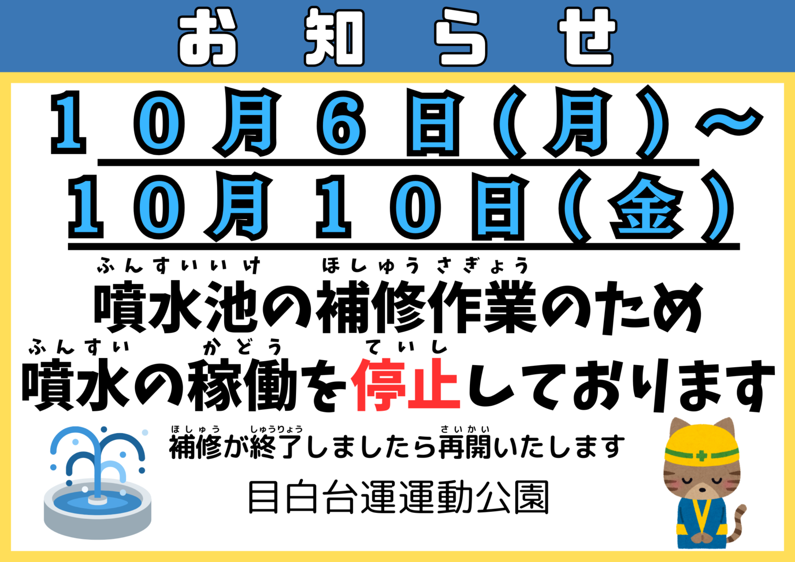 10/6(月)~10/10日(金)の期間、噴水池の補修を行うため噴水池の水を停止いたします。